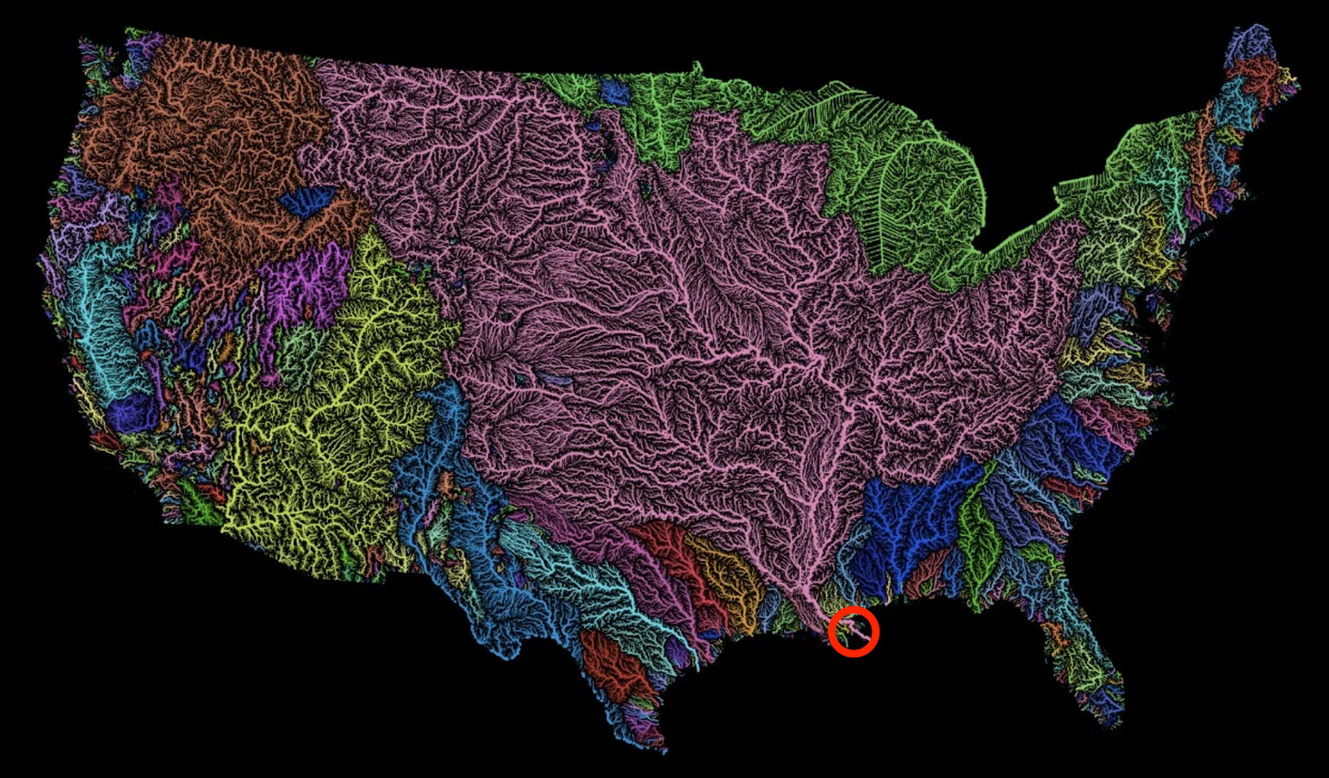 Каждая капля воды, которая находится внутри розовой области гарантированно пройдет через точку схождения: место, где Миссисипи впадает в Атлантический Океан. Благодаря гравитации вся вода стекается в одну точку.